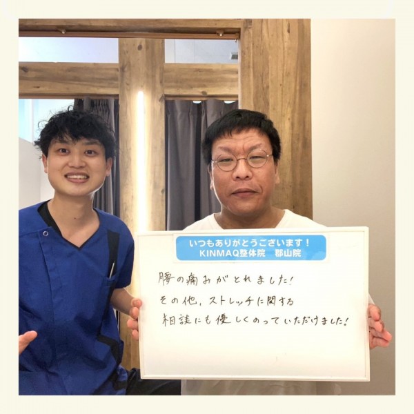 お客様のお声 お客様のお声 こんにちは!KINMAQ整体院 吹田院です😌お客様からいただいたお声をご紹介いたします🍀 「腰の痛みがとれました!その他ストレッチに関する相談にも優しくのっていただけました!」と、ありがたいお言葉をいただきました✨ ストレッチを通して日頃のお身体のケアをしていただき、不調を感じないお身体を継続させていきましょう!この度はKINMAQ整体院にご来院いただき、誠にありがとうございました。
