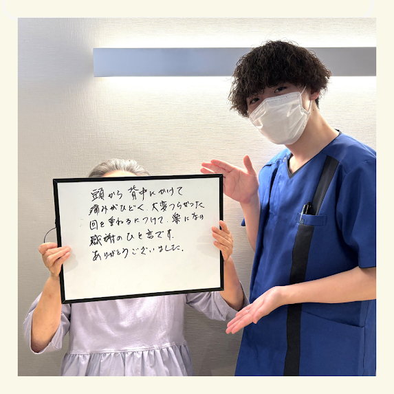 「頭から背中にかけて痛みがひどく、大変つらかった。回数を重ねるにつれて楽になり、感謝のひと言です。ありがとうございました。」