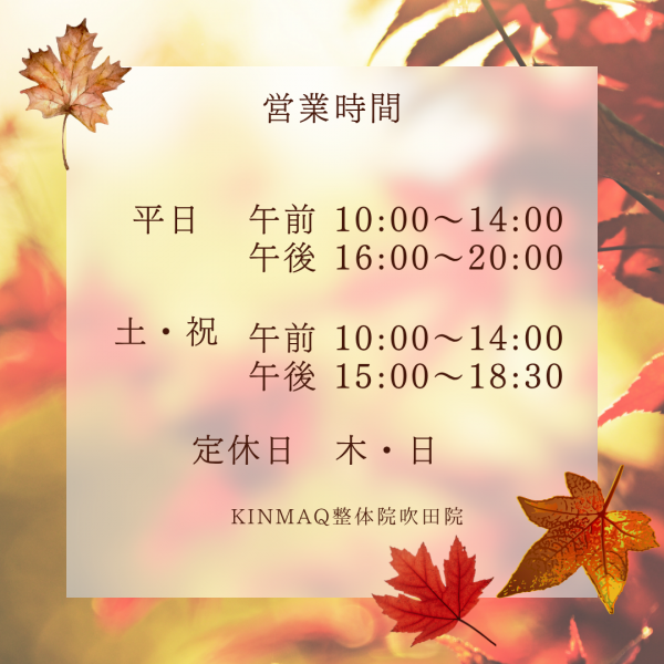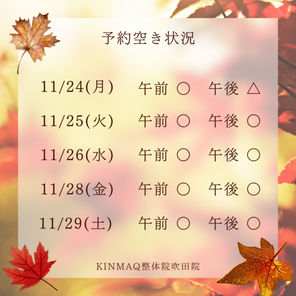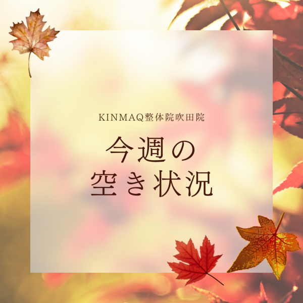 今週の予約空き状況 今週の予約空き状況 こんにちは!KINMAQ整体院 吹田院です🍁 今週の予約空き状況をお知らせいたします。 今週は予約枠を多めにご用意しております!お身体にお悩みのある方、筋膜にご興味のある方、この機会に当院をお試しください💪また、当日の空き状況はストーリーでお知らせしております。ぜひご確認ください。 ※予約は先着順となります。