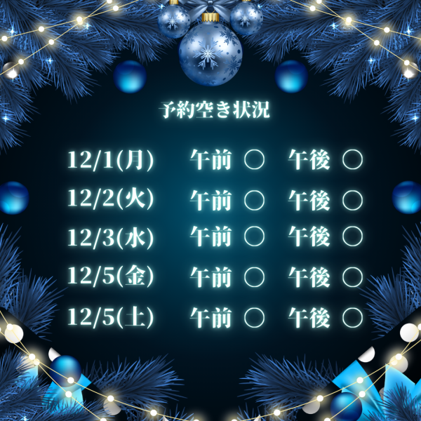 今週の予約空き状況 今週の予約空き状況 こんにちは!KINMAQ整体院 吹田院です❄️ 今年も残り1ヶ月をきりましたね。寒さも本格的になり、年末に向けてお忙しい日々をお過ごしのことと思います。疲れが溜まりやすい時期ですので、体調管理にはくれぐれもお気をつけください🙂↕️ 今週の予約空き状況をお知らせいたします。 今週は予約枠を多めにご用意しております!お身体にお悩みのある方、筋膜にご興味のある方、この機会に当院をお試しください💪 ※予約は先着順となります。