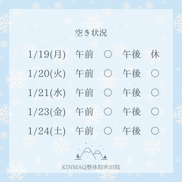 今週の予約空き状況 今週の予約空き状況 こんにちは!KINMAQ整体院吹田院です⛄ 今週の空き状況をお知らせいたします。今週はご予約に余裕がございます!ご来院をご検討中の方は、お気軽にお問い合わせ下さい☺️ 1月19日(月)はセラピスト研修のため、午後から臨時休業とさせていただきます。皆様にはご迷惑をおかけいたしますが、何卒よろしくお願いいたします🙇🏻♀️ ※予約は先着順となります。