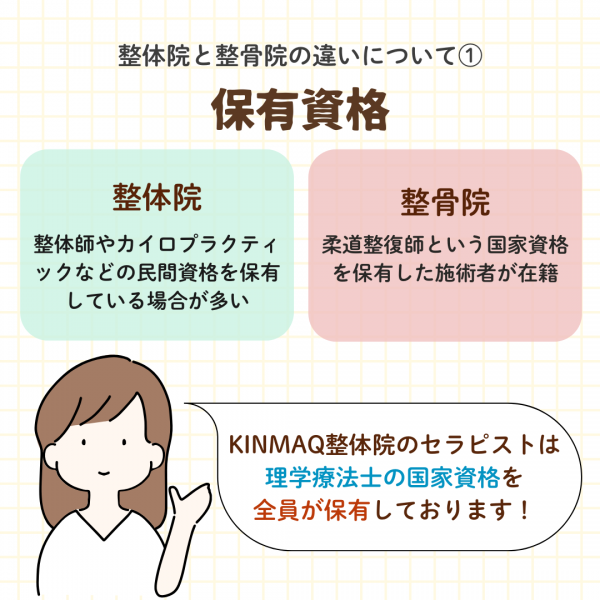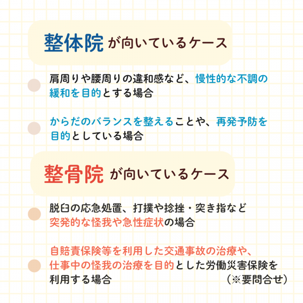 整体院と整骨院では、保有資格の違い、保険適用の有無、施術内容の違いなどがあり、それぞれのメリットを理解して自分に合った施術院を探すことが重要です